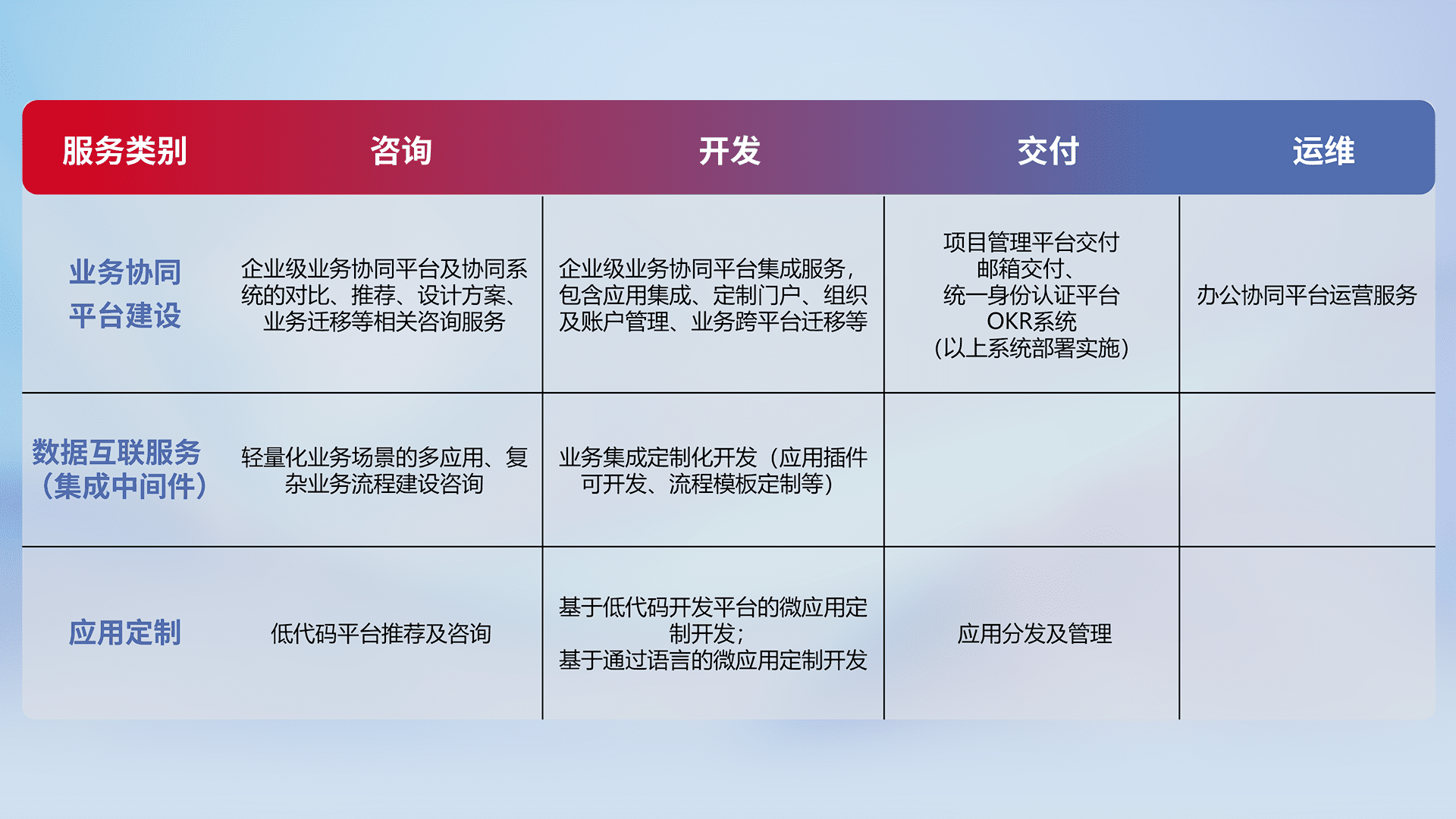 针对钉钉、、企微、、、、IDaas等平台级产品提供产品的规划、、、方案、、、、交付、、、、定制化开发等服务,,实现如统一协同办公、、智能客户服务、、、混合会议管理、、智能数据查询、、、等业务场景,,实现数字化转型。。。